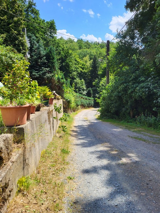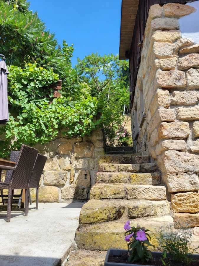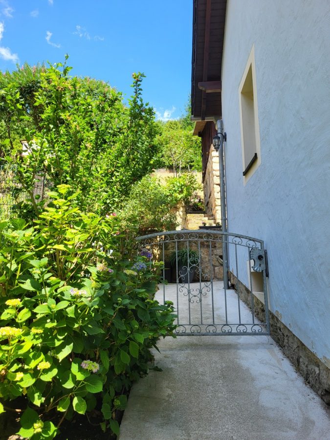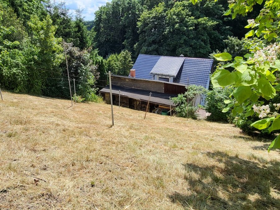 _am oberen Ende des Grundstücks befindet sich ein massiv gebauter renovierungsbedürftiger Bungalow mit großer Terrasse und einzigartigem Weitblick über das Poisental