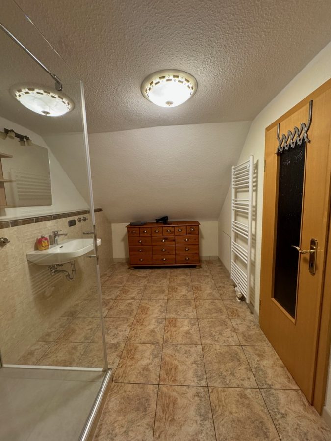 _weitläufiges Tageslichtbad mit zwei Teilbereichen – einem innenliegenden Bereich mit Dusche, Waschtisch und Handtuchheizkörper und einem Bereich mit Fenster, WC und Waschtisch