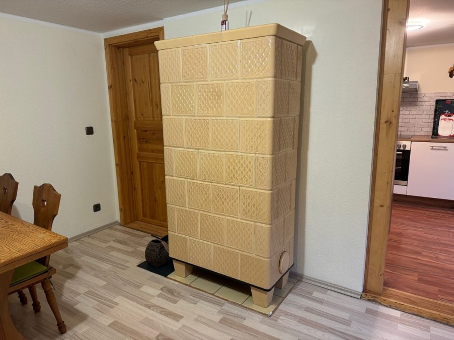_gemütliches Wohnzimmer mit großem Ofen – separate Tür zum Flurbereich